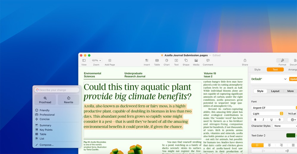 Strumenti di scrittura. Apple Intelligence può aiutarti a correggere i testi, prepararne diverse versioni fino a trovare il tono e le parole ideali, e riassumere le parti selezionate: ti basta un clic.